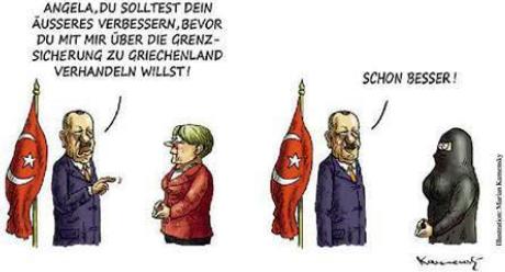 Der Blamage nicht genug, biedert die EU sich in der Flüchtlingsfrage auch noch dem türkischen Hardliner, Ministerpräsident Recep Erdógan, an. Der ist in letzter Zeit nicht nur wegen der Einschüchterung der Presse, Kurdenverfolgung, Bombenangriffe im Irak und Mundtotmachung politischer Gegner international aufgefallen, sondern auch wegen seiner – sagen wir – "gewagten" Thesen: So behauptet er, "nicht Christoph Kolumbus, sondern Muslime hätten Amerika entdeckt"; Frauen seien bestenfalls gleichwertig, könnten aufgrund ihrer "zarten" Beschaffenheit nicht so hart arbeiten wie Männer, und für alle in der EU lebenden Türken sei immer noch er, Erdógan, zuständig. Sein Premierminister, Ahmet Davutoglu, will sogar die Ursache entdeckt haben, wieso die Selbstmordrate in Europa so hoch ist: Weil dort Gleichberechtigung zwischen Mann und Frau herrscht.