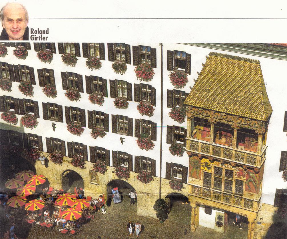 Seit damals, also seit dem 15. Jahrhundert, soll auf der kroatischen Insel Korcula der Moriskentanz jährlich am 29. Juli aufgeführt werden, ähnlich auch in England. Hier am Relief des "Goldenen Dachls" fällt auch ein Schriftband auf, das bis heute nicht entziffert werden konnte. Es ist höchst geheimnisvoll. Ich überlege, ob nicht arabische Zeichen Pate für diese Schrift gestanden sein könnten. Der Maler war vielleicht nicht einer von den Morisken, die hier prächtig dargestellt sind, begeistert, sondern auch von der Schrift der Mauren. Genaue Hinweise fehlen. Ich blicke herum und setze mich, es ist ein warmer Tag, in den Sessel eines Kaffeehauses unweit beim "Dachl". Ich genieße meinen Tee. Noch etwas fällt mir hier auf. An einer Tafel wird eines gewissen Jakob Hutters gedacht, der im Jahre 1536 in Innsbruck beim "Goldenen Dachl" als Ketzer verbrannt wurde. Nicht nur die Mauren erschienen den katholischen Kaisern für gefährlich, sondern auch dieser wackere Jakob Hutter. Er ist der Namensgeber für die heute noch in Kanada und den USA lebenden Hutterer, die einen alten deutschen Dialekt sprechen. Jakob Hutter stammte aus dem kleinen Ort St. Lorenzen bei Bruneck in Südtirol. Als Hutmacher hatte er sich auf Wanderschaft begeben und hatte sich dabei mit jenen Leuten zusammengetan, die meinten, nur die Erwachsenentaufe würde die echte sein. Man nannte sie die Täufer oder Wiedertäufer. Diese Leute wurden brutal verfolgt. Einige wanderten von Tirol nach Mähren aus. Hutter selbst blieb zunächst in Tirol. 1527 hatte Erzherzog Ferdinand verkündet, dass man derartige "verführerische Lehren und ketzerischen Sekten" nicht dulden werde. Um der Verfolgung zu entgehen, flüchtete nun auch Jakob Hutter nach Mähren. Unter seiner Führung erreichten die Täufer in Mähren eine Blütezeit, Siedlungen wurden gegründet, in denen die urchristliche Gütergemeinschaft verwirklicht werden konnte. Hutter reiste wieder nach Tirol, das war sein Fehler, denn am 30. 11. 1535 wurde er in Klausen verhaftet. Er wurde grausamen Verhörmethoden unterzogen, die ihn aber nicht brechen konnten. Im Februar 1536 wurde er schließlich hier beim "Goldenen Dachl" verbrannt. Daran denke ich, während ich meine Schritte zum Bahnhof lenke. Ich wünsche Herrn Dr. Johannes Panhofer und jenen Damen und Herren, die ich in seiner Umgebung kennen gelernt habe, das Beste und ziehe weiter.
